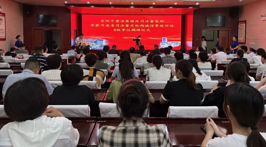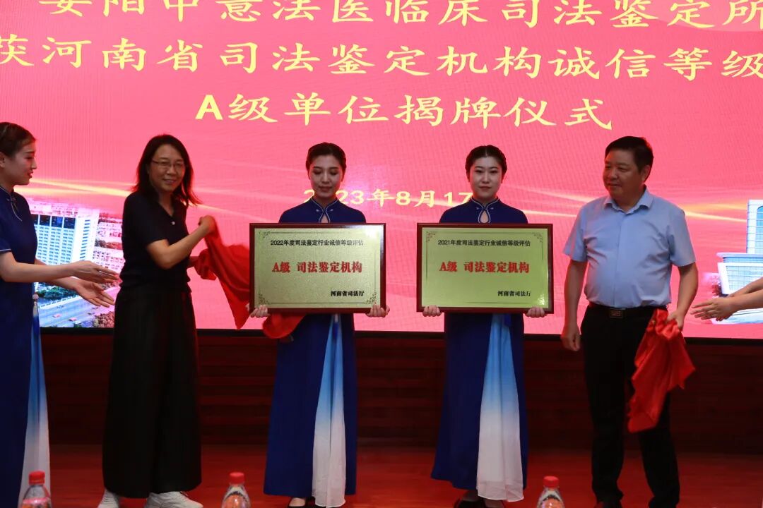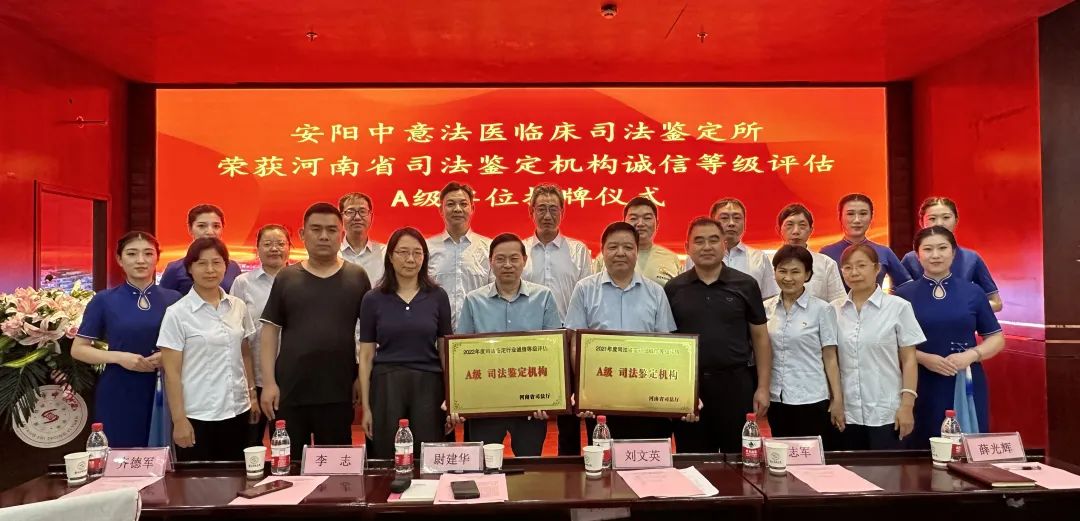 8月17日下午,安阳中意法医临床司法鉴定所荣获河南省司法鉴定机构诚信等级评估A级单位揭牌仪式在我院举行。